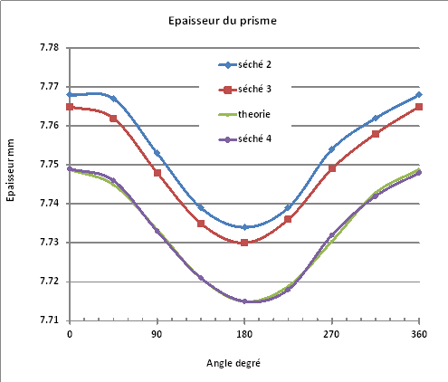 La déviation donnée par un prisme de petit angle est (n-1)A ou A est l'angle du prisme. Pour un angle de 1.5 minute cela donne une déviation de l'ordre de 45" ce que j'ai choisi. Sur 80mm la différence d'épaisseur entre le coté mince et épais du prisme est de 35µm. Cet angle est très facile à obtenir avec quelques séchées