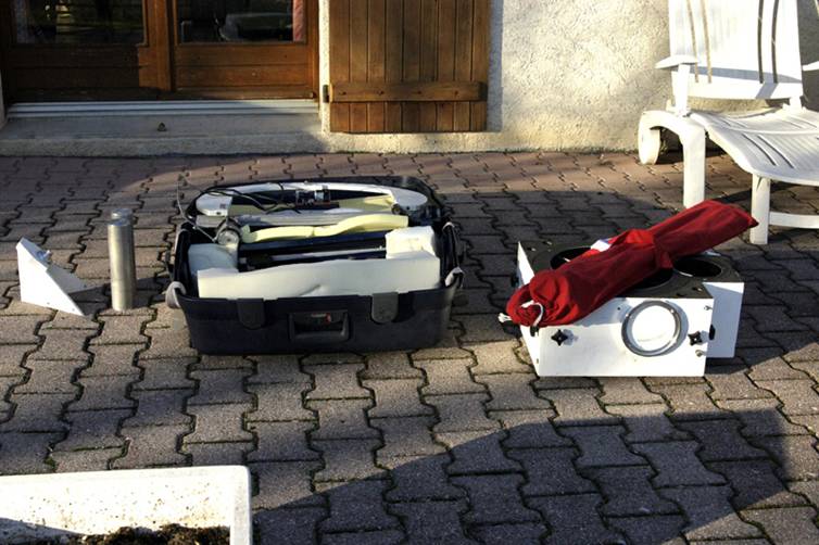 3) quelques pièces sont sorties: la boite a miroirs avec la cage du secondaire à droite sous le sac, les contrepoids et le pilier sud sont a gauche de la valise