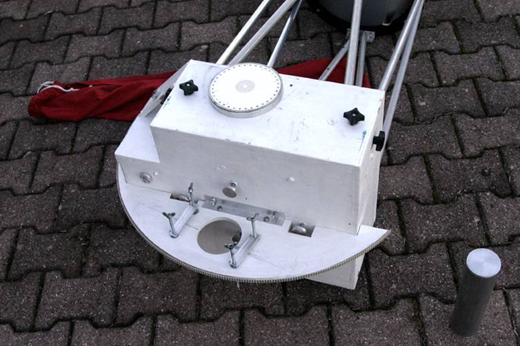 10) Le télescope sorti de sa valise. il faut environ 45mn pour monter l'ensemble du télescope non optimisé pour la vitesse de montage mais pour la compacité. Les réglages de collimation sont étonnamment stables. Le chercheur est une demie jumelle de 50mm